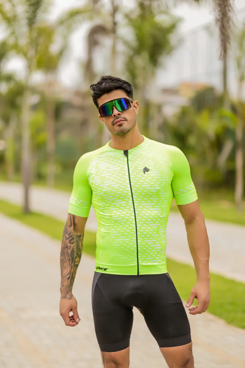 Tratamento UV, minimizando a ação de raios ultra violetas UV-A e UV-B, evitando queimaduras e o envelhecimento precoce da pele; Tecido das mangas com boa elasticidade e com melhor ajuste junto ao braço, tendo finalização por corte a laser. costuras flat-lock, consiste em uma costura plana onde o tecido fica mais próximo ao corpo, além de não causar irritações comuns de costuras tradicionais. Zíper semiautomático, este tipo de zíper possui uma pequena trava especial que possibilita a fixação total do fecho, mantendo-o na altura desejada, mas também permite a sua liberação de forma prática e rápida;Acabamento na gola, evitando o contato do cursor zíper com a região do pescoço, não causando irritações na pele. Três bolsos traseiros com amplo espaço para carregar o que for necessário durante seu pedal, seja alimentos e géis ou até mesmo ferramentas e utensílios.
